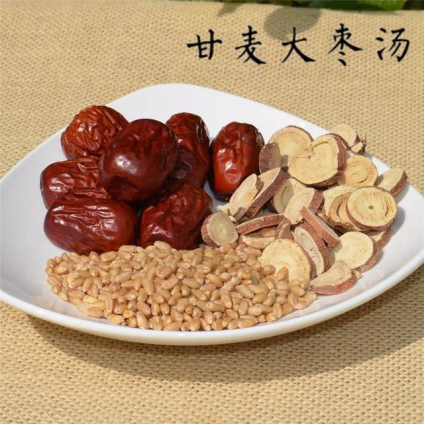 原料:小麥1兩(50克)、大棗9個(gè)、甘草9克。